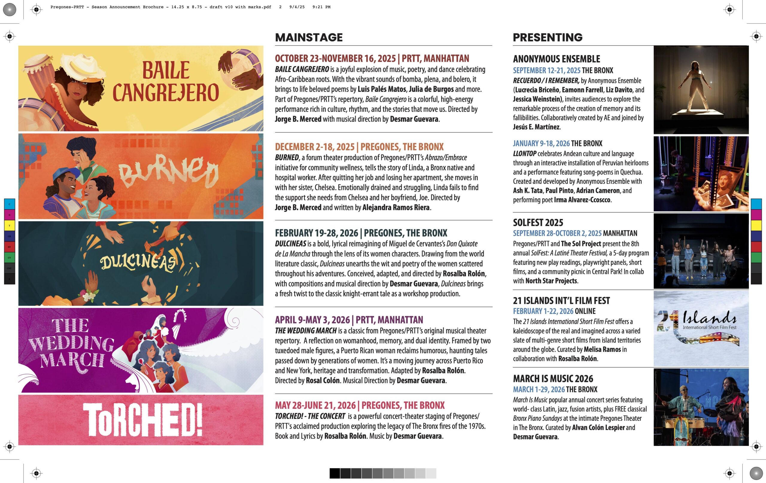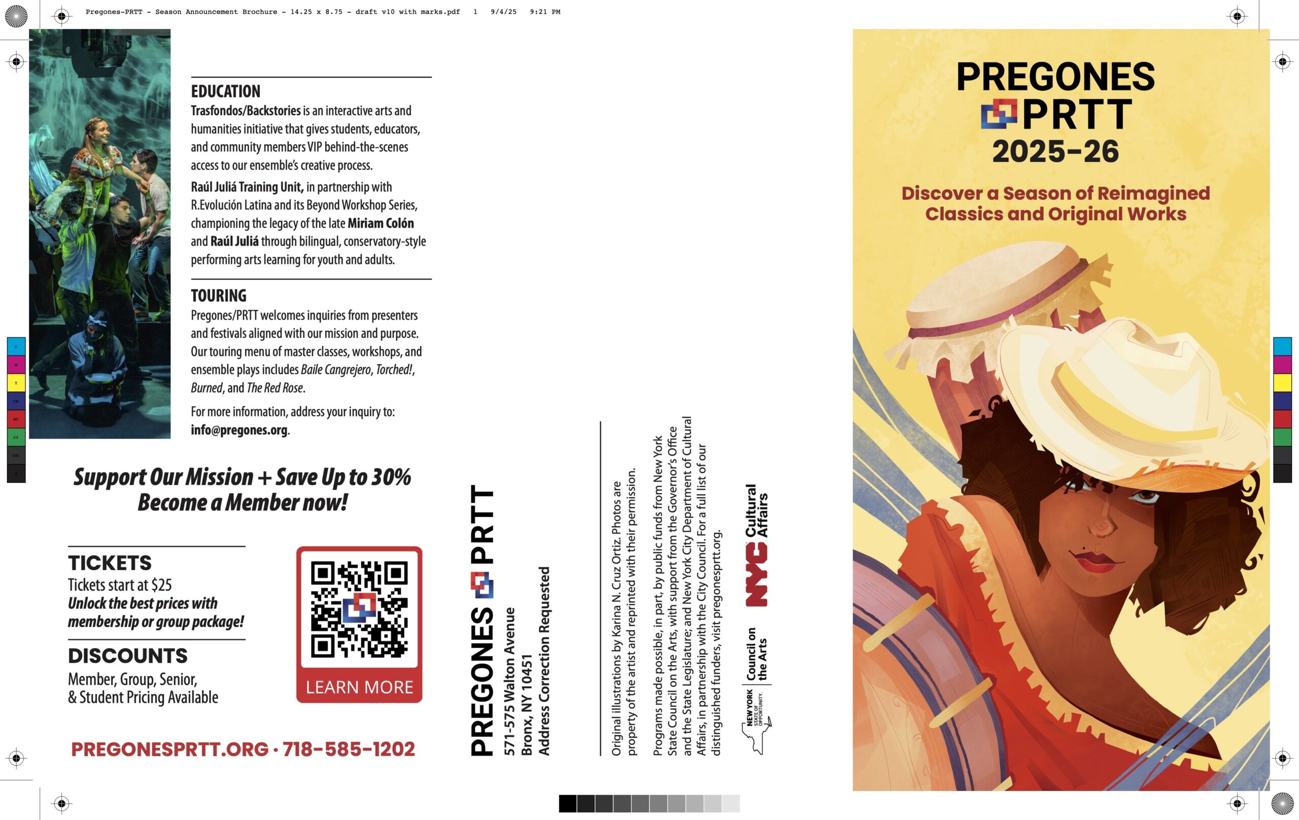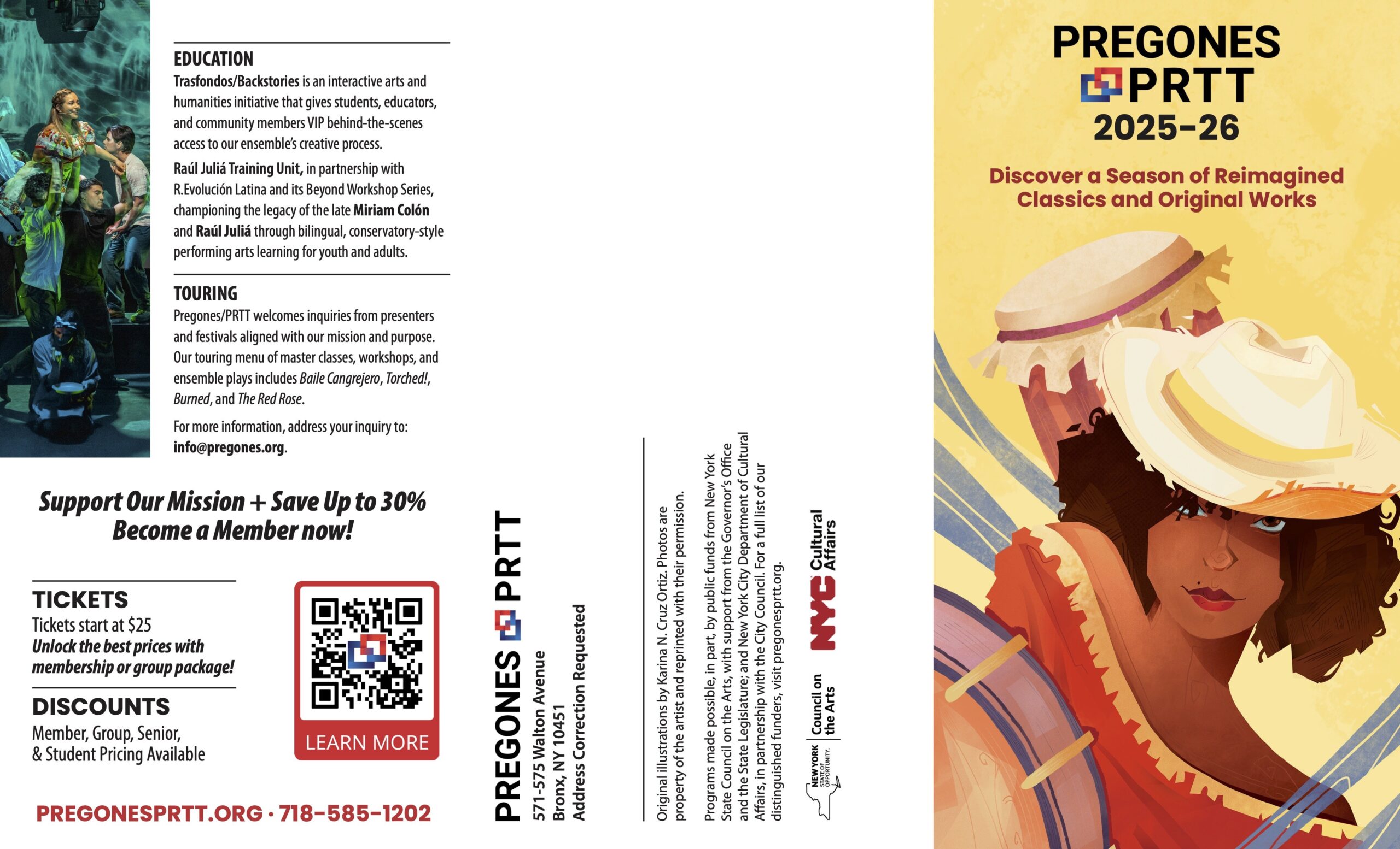 We collaborated with Pregones/Puerto Rican Traveling Theater (PRTT) to design the 2025–26 Season Announcement Brochure, showcasing the organization’s upcoming mainstage productions, festivals, concerts, and community programs. The tri-fold mailer introduced the new season’s theme, “A Season of Reimagined Classics and Original Works,” and served as both a promotional and development tool for donors, members, and subscribers.